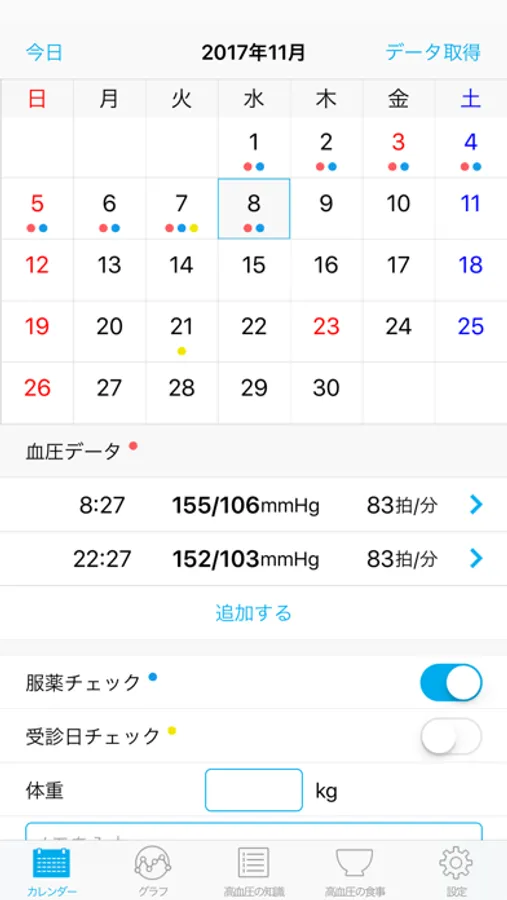 ・カレンダーから毎日の血圧、服薬履歴、受診日を管理できます。