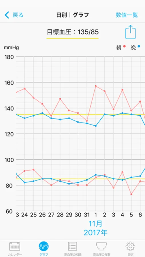 毎日の血圧データを、カレンダーとさまざまなグラフで簡単に管理できます。
