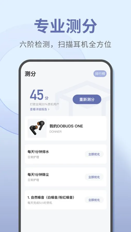 【专业测分】六阶检测,扫描耳机全方位。通过分析建议,设备状态一目了然。从白噪音煲,到定向性能煲,对耳机六大维度(高音、中音、低音、结象、声场、动态)进行定向提升。