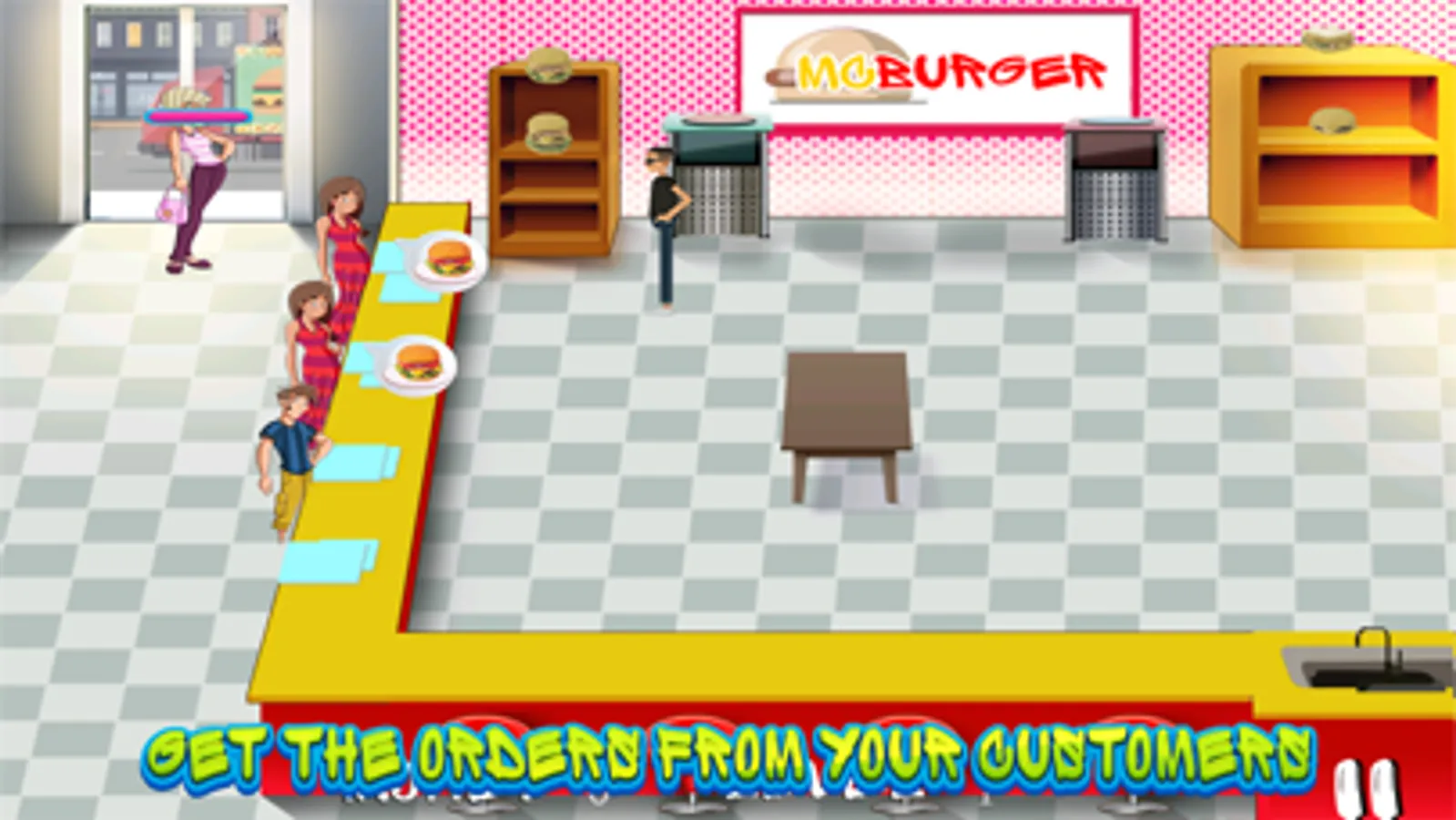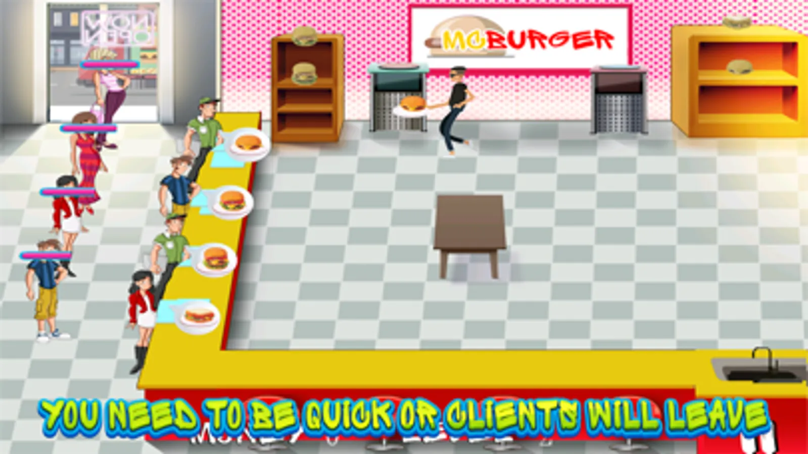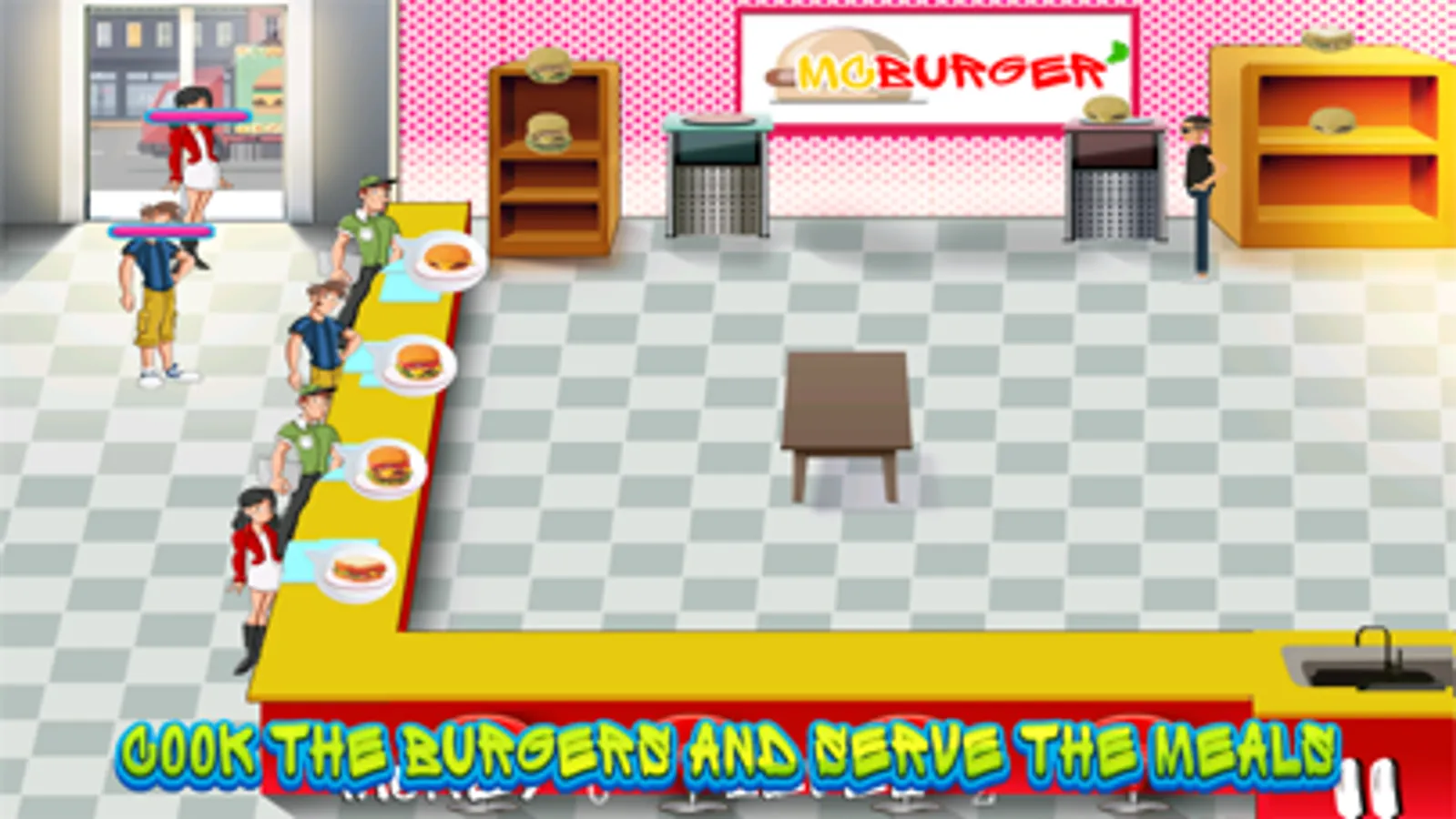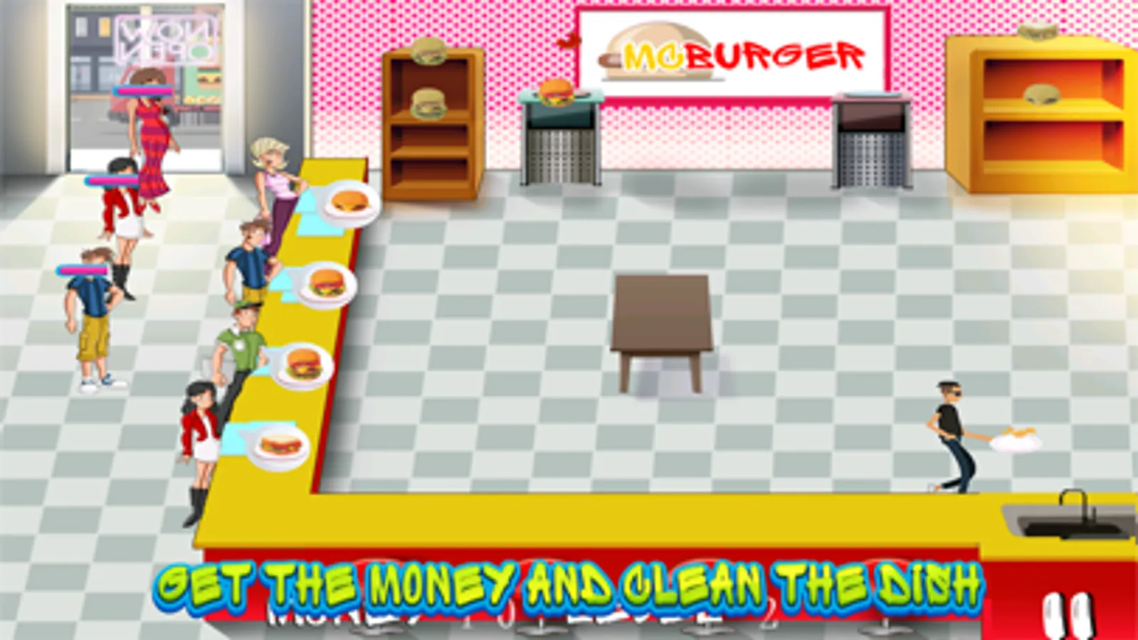 The customers enter the restaurant and stand in a queue. There are two shelves, one has burgers and other has sandwiches. Then you (the cook) have to take their orders and spoof the burgers and sandwiches in the oven according to their need. You should be quick to make their order, and serve them one by one. After that, collect the money from them and wash the dishes. As fast as you will be, you can collect much money, and proceed to the next level.