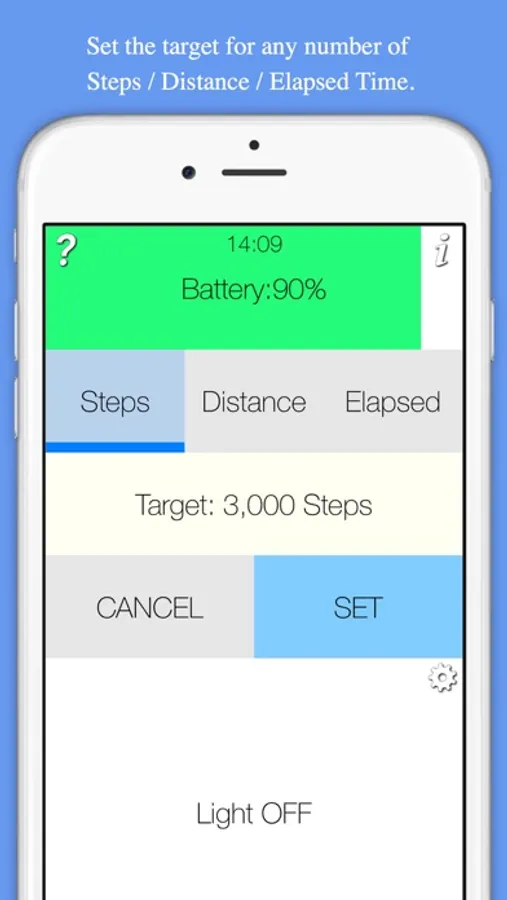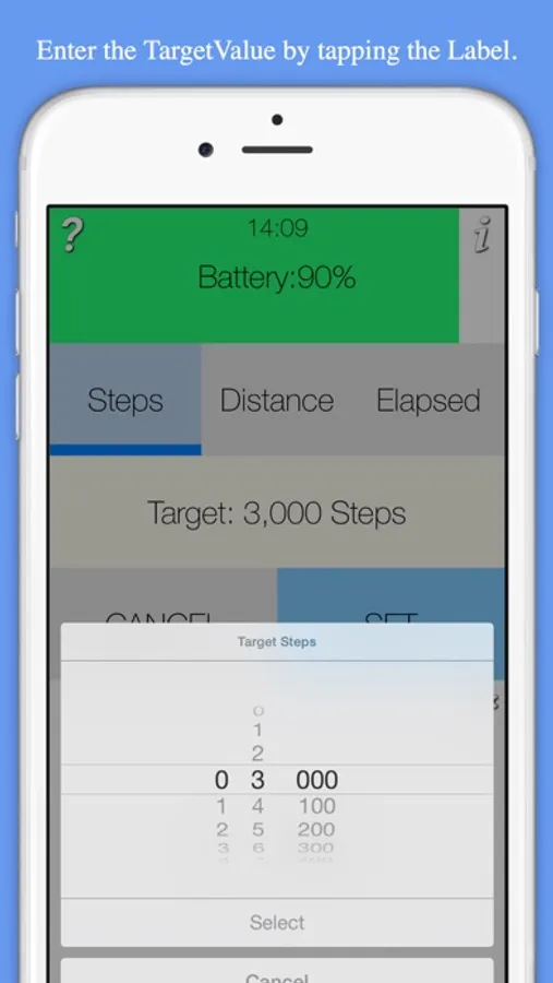 In the pedometer, it is possible to set the target for any number of steps / distance / elapsed time. To set the target value, select the object to open the target setting screen, enter the target value by tapping the label. Notify by voice Once you reach the target number of steps / distance / time elapsed.