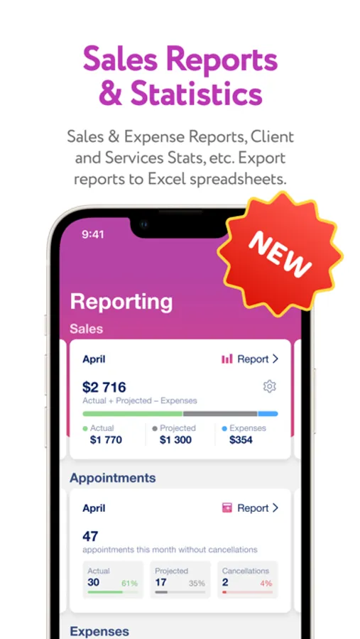 Sales & Expense Reports, Client and Services Stats, etc. Export reports to Excel spreadsheets.