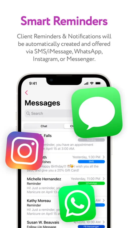 Client Reminders & Notifications will be automatically created and offered via SMS/iMessage, WhatsApp, Telegram, or email.