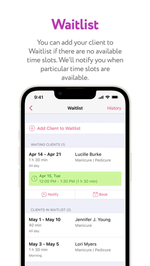 You can add your clients to Waitlist if there are no available time slots. We’ll notify you when particular time slots are available.