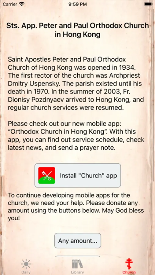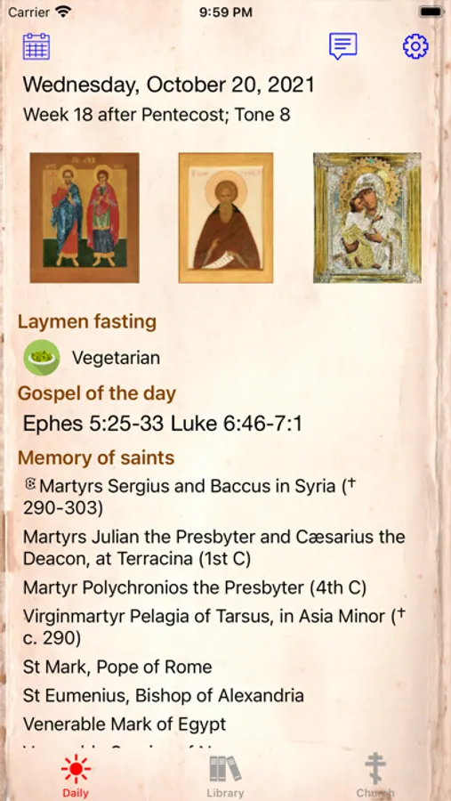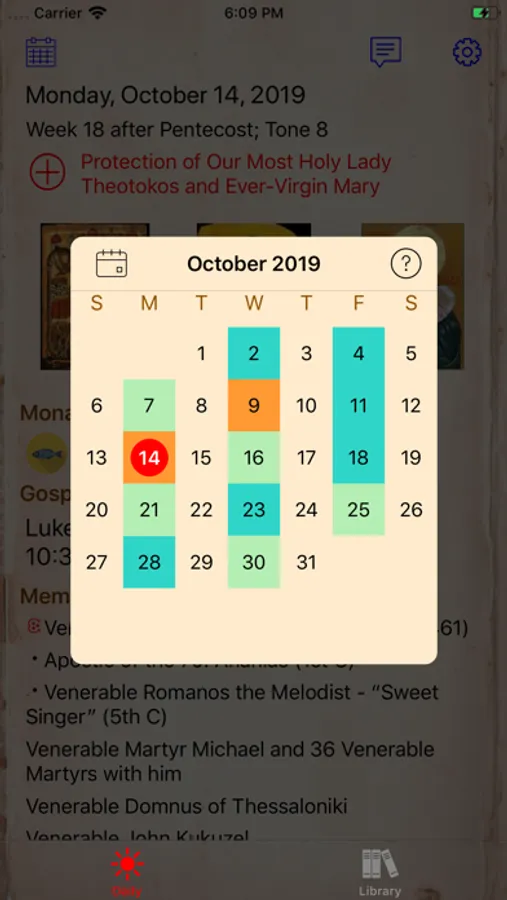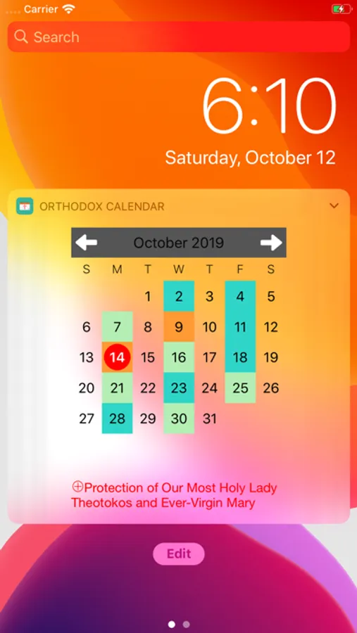 This is Russian Orthodox Church calendar app, which includes schedule of fasting, Gospel reading, and other information. The app provides a home screen widget showing monthly calendar.
