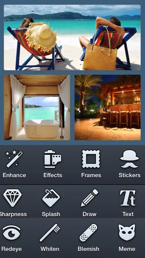 You can dress up your photo with many editing tools such as effects, filters, frames, stickers, drawing, text, adjustment of brightness, removal of blemish, whitening etc.