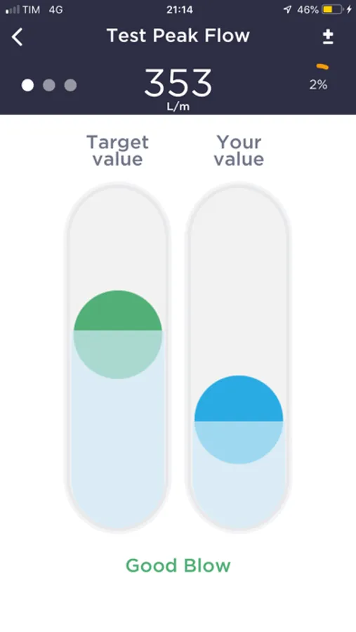 The app compares the parameter measured by the device with the target value set during configuration, displaying a traffic light health indicator (green, yellow or red) that makes it easy to interpret the test result.