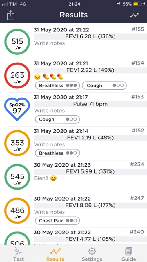The test results are automatically stored on the smartphone and can be displayed later. For each test the user can add useful information such as symptoms, with the severity grade, and notes.