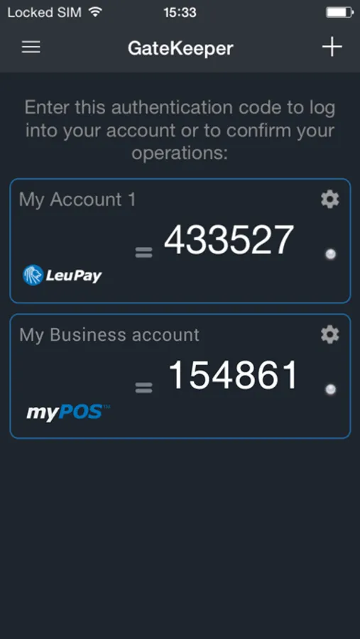 If you enable the GateKeeper authentication method, you will log into your accounts with a special one-time confirmation code generated from this app. The generate codes are unique for each of your accounts and constantly changing.