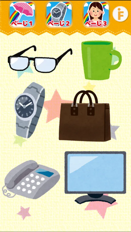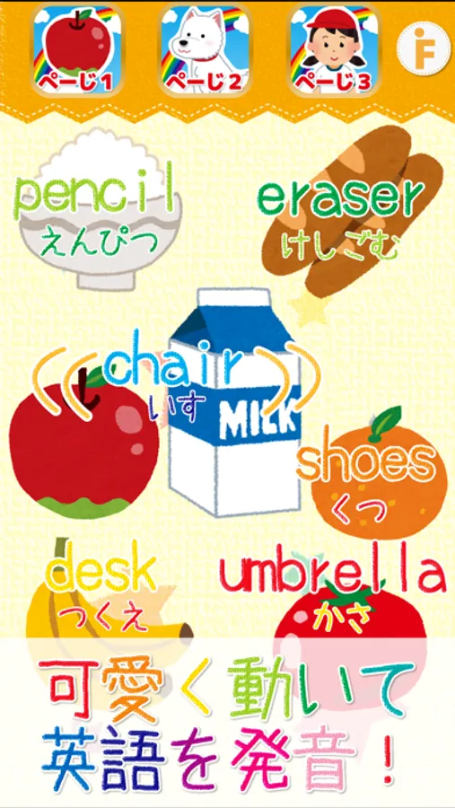 イラストをタッチすると、英語の発音をしながらイラストが動いてお子さまを楽しませる知育アプリです。