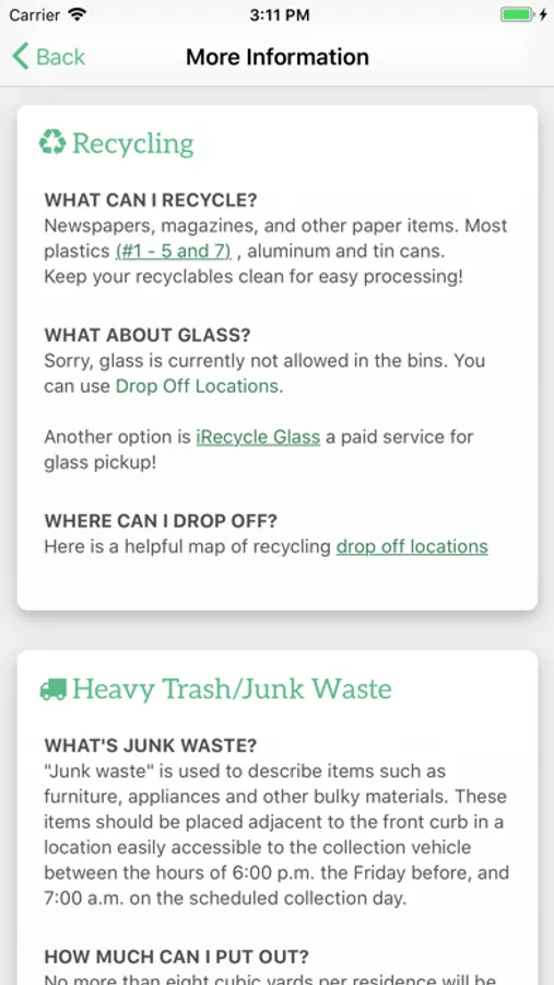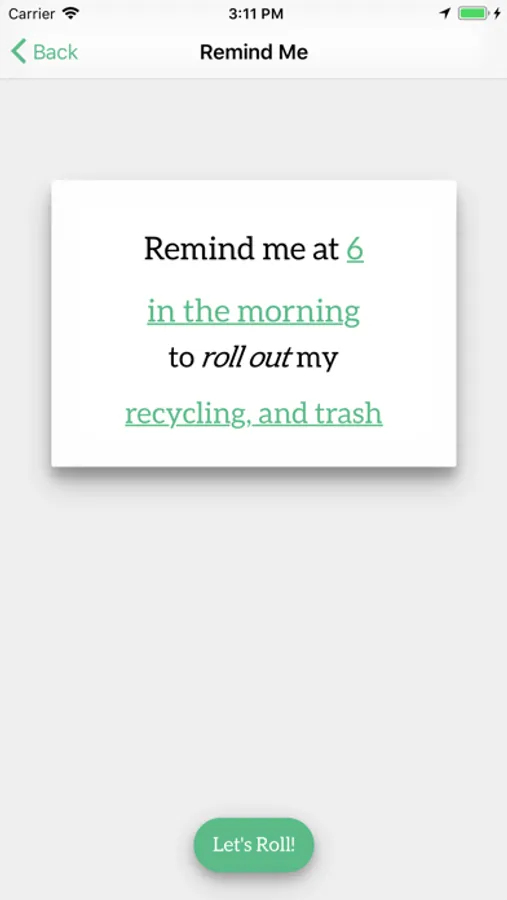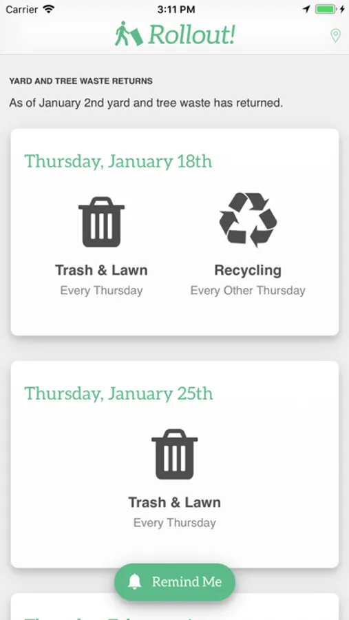 Forget about peeking outside to see if your neighbor's bins are out, with Rollout! we use your phone to look up your location and instantly let you see your schedule for your neighborhood. You can set up reminders to tell you when to take out your trash to make sure you don't miss recycling day again.