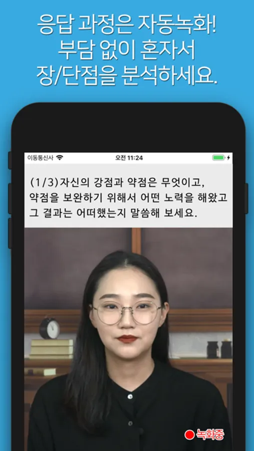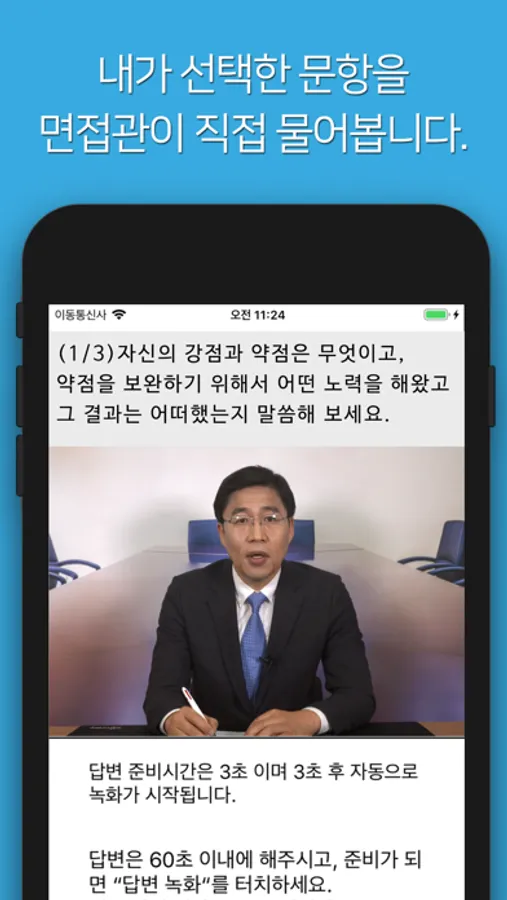 - 사용자가 면접유형과 면접질문을 선택하면 가상면접관이 실제면접처럼 질문을 던지고, 응답내용이 스마트폰을 통하여 자동녹화 됩니다.