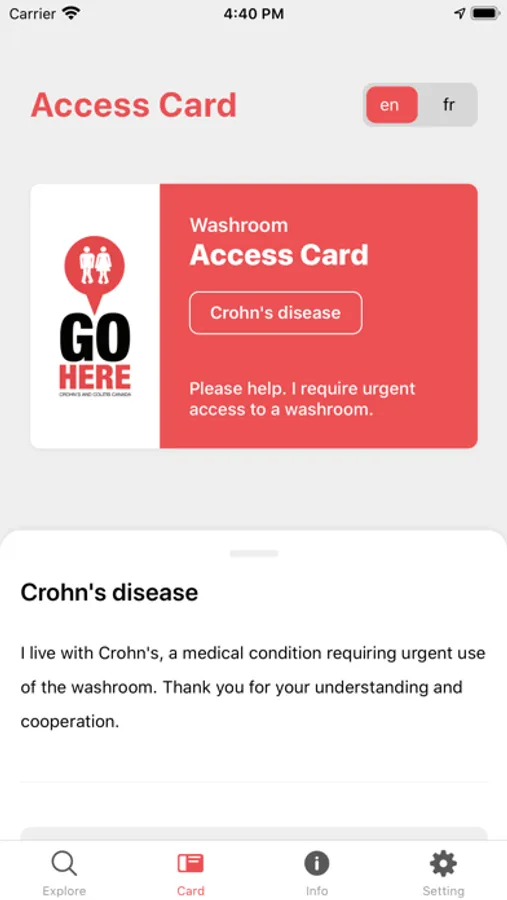 Need to find a washroom fast? GoHere is a free app which helps you find washrooms in the GoHere Initiative’s participating businesses and government buildings closest to you, or along the route to your destination. You may also use the Washroom Access Card to quickly explain your medical need. This app is designed to help users with incontinence issues, in particular those with Crohn's disease or ulcerative colitis - the two main forms of inflammatory bowel disease (IBD). GoHere is provided courtesy of Crohn's and Colitis Canada. Visit us at www.go-here.ca and www.crohnsandcolitis.ca for more information.