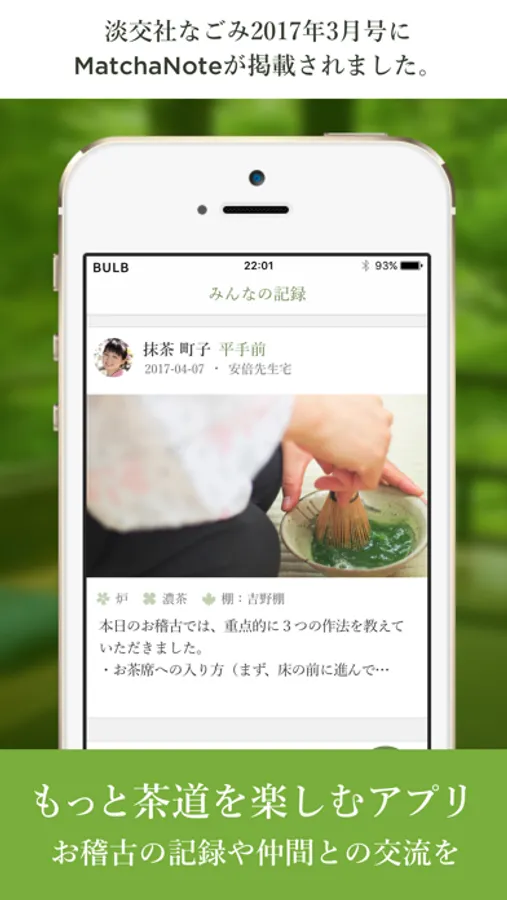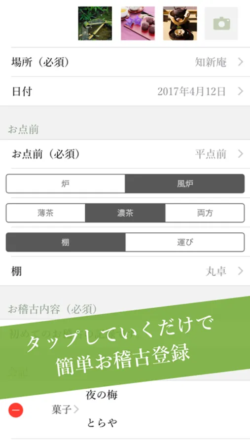 MatchaNote is an application that lets you easily record Japanese tea ceremony lessons and track progress. In addition, you can learn about various information related to tea ceremony and the Way of Tea in general, such as common seasonal names for tools and Japanese confectioneries.