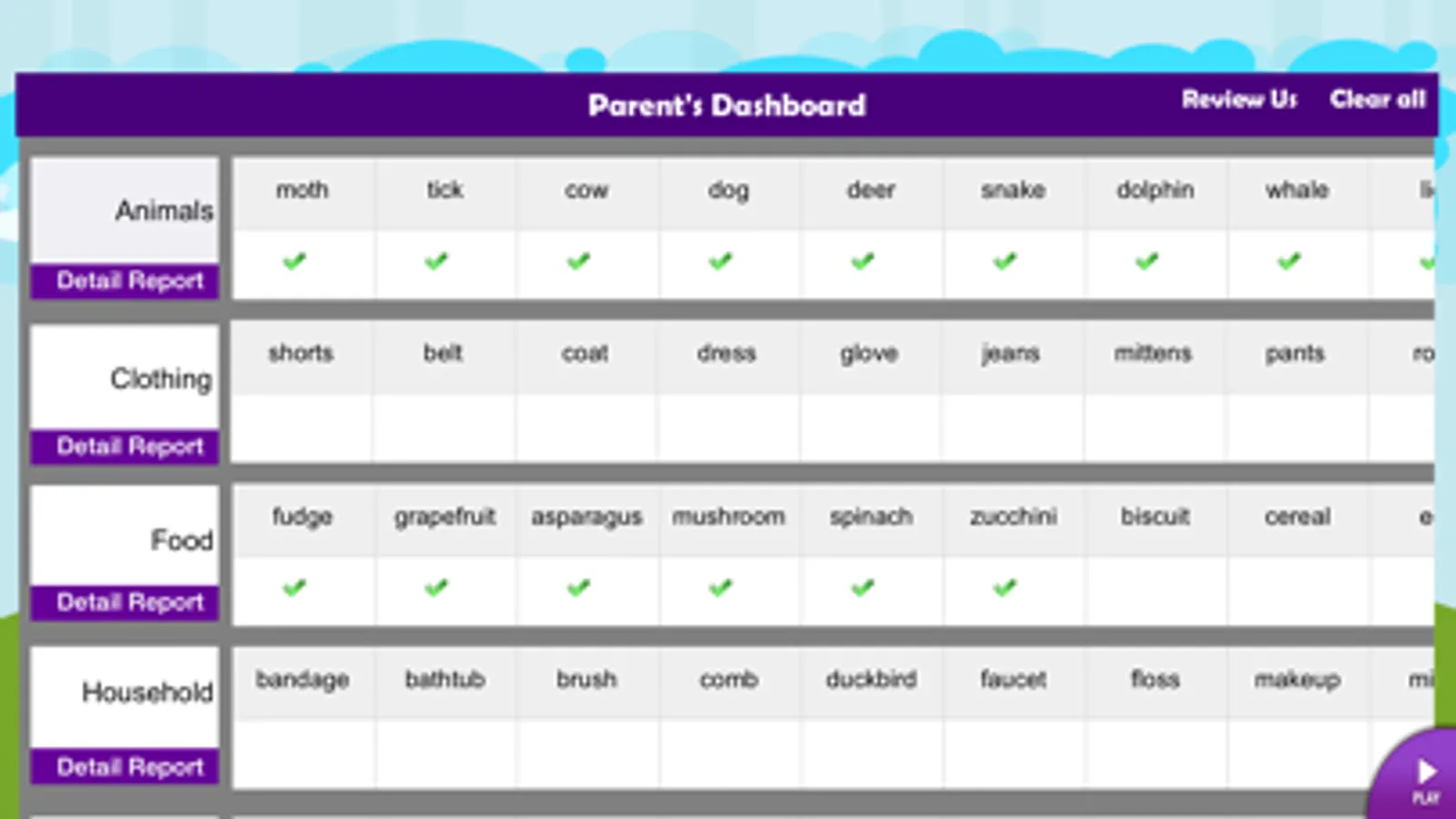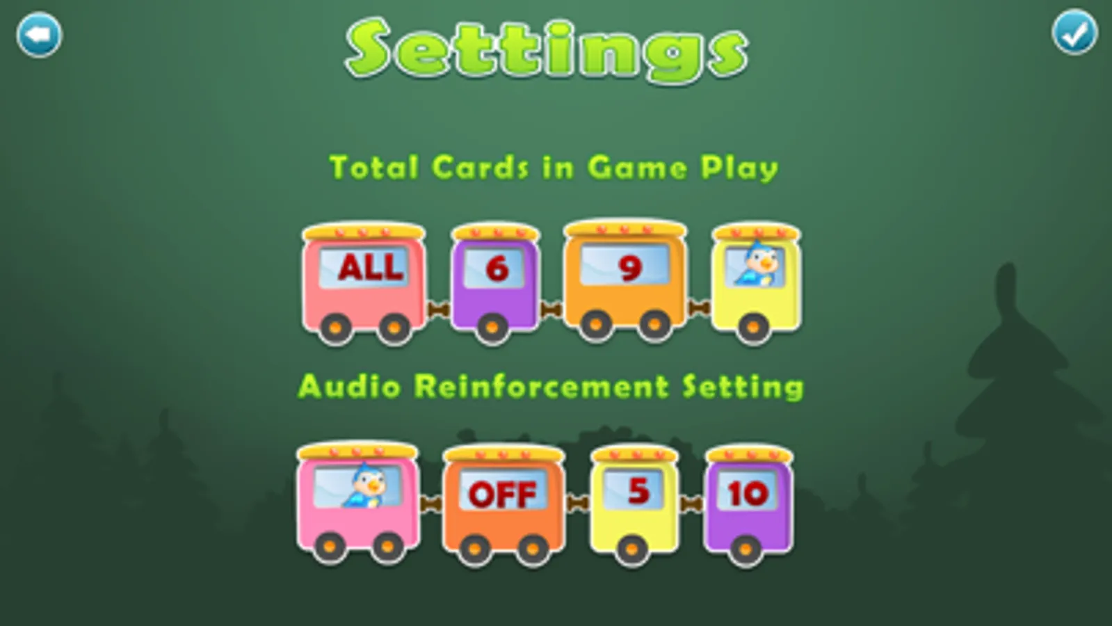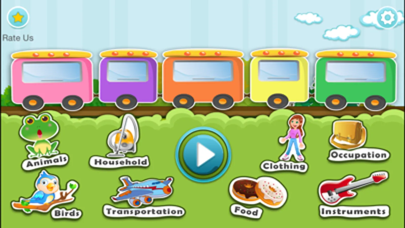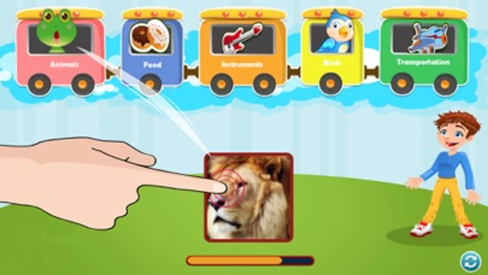 Let your child choose the categories to play. Let them hear the word for each card and sort them by dragging cards into respective categories. Amount of cards left in the play are shown by the progress bar at the bottom of the screen. You can also choose to shuffle the cards by clicking at the bottom right button.