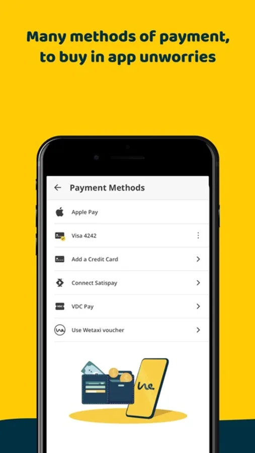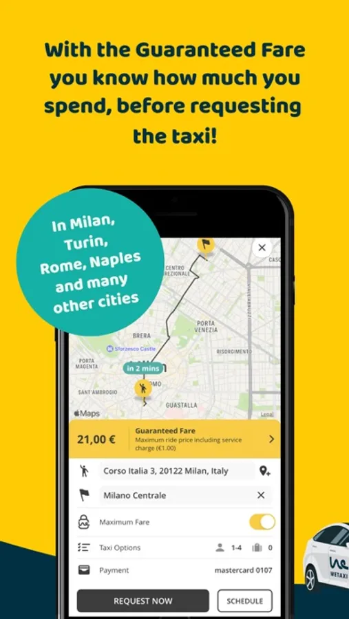 - It's convenient: pay on board or easily in the app, choosing between credit card, Satispay or Wetaxi credit