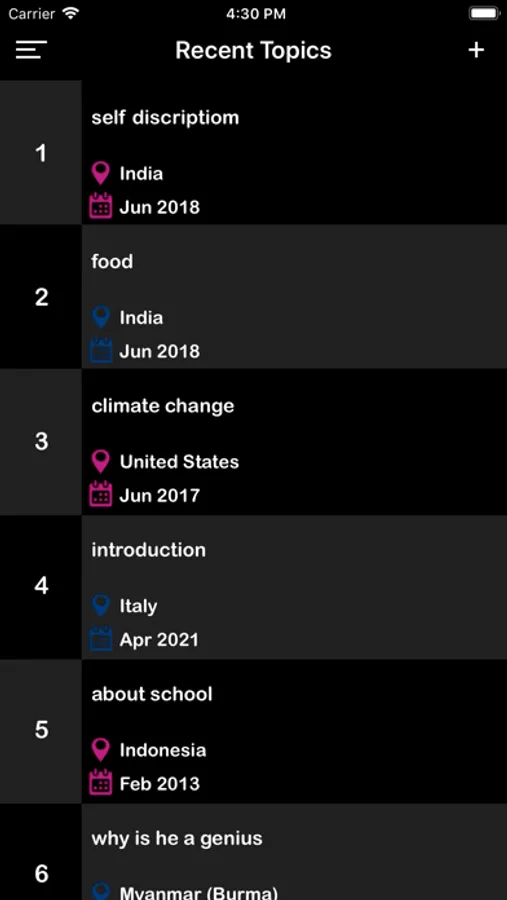 - IELTS speaking application shows list of speaking topics at particular date with exam taken country.