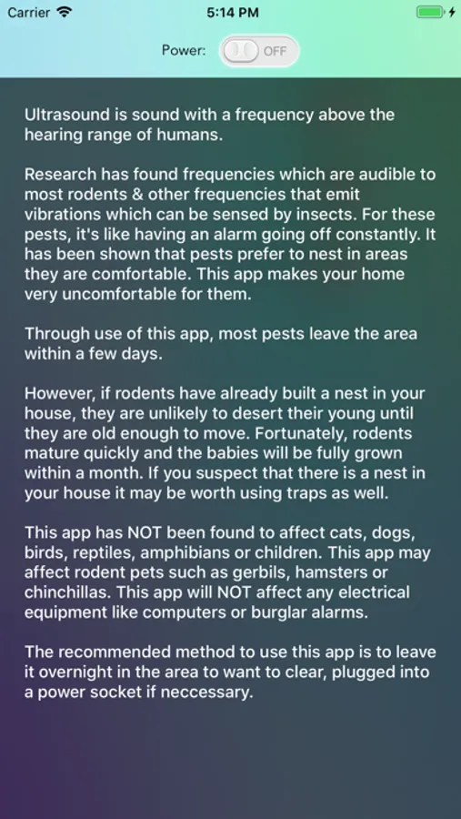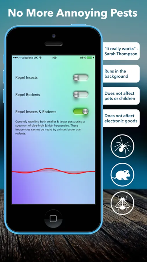 The frequencies have been specifically selected so that the sounds are audible to most rodents & the vibrations can be sensed by insects. For these pests, it's like having an alarm going off constantly. It has been shown that pests prefer to nest in areas they are comfortable. This app makes your home very uncomfortable for them.