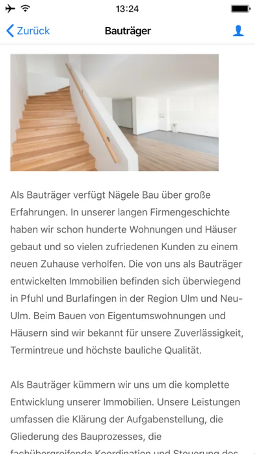 Bei Nägele Bau finden und kaufen Sie Immobilien in den Neu-Ulmer Stadtteilen Burlafingen und Pfuhl. Nägele BAU ist Bauunternehmen, Wohnbau/Bauträger, Architekturbüro und Zimmerei und Dachdeckerei in einem. Wir planen, bauen und verkaufen unsere Immobilien selbst, ob Eigentumswohnung, Reihenhaus oder Einfamilienhaus, im Wohnbau und im Gewerbebau. Sie kaufen Ihre Immobilie bei uns immer provisionsfrei direkt beim Wohnbauunternehmen. Wir sind kein Immobilienmakler. Sie haben Sie die Möglichkeit Ihre neue Immobilie (ob Haus, oder Eigentumswohnung) aktiv mitzugestalten um Ihren optimalen Lebensraum zu erhalten. Aufgrund dessen, dass wir Bauunternehmen, Bauträger und Architekturbüro in einem sind entfallen viele sonst übliche Schnittstellen in der Bauabwicklung. Wir können dadurch viel individueller auf Ihre Wünsche und Anforderungen an Ihre neue Immobilie eingehen. Mit unseren Geschäftsbereichen: Bauträger/Wohnbau, Bauunternehmen, Vermietung und Architektur können wir Ihnen unter einem Dach erfahrende und professionelle Dienstleistungen rund um die Immobilie anbieten. Nägele BAU gehört zu den alt eingesessen Bauunternehmen von Neu-Ulm/Burlafingen. Unser Aufgabenschwerpunkt liegt in den Neu-Ulmer Stadtteilen Pfuhl und Burlafingen. In der App informieren wir über unsere aktuellen Bauprojekte. Über unsere Facebookseite: Immobilienportal Ulm/Neu-Ulm behalten Sie den Ulmer/Neu-Ulm Immobilienmarkt im Blick. Alle Angebote vom Immobilienportal Ulm/Neu-Ulm erscheinen auch auf dieser App. Viele Freude mit unserer APP
