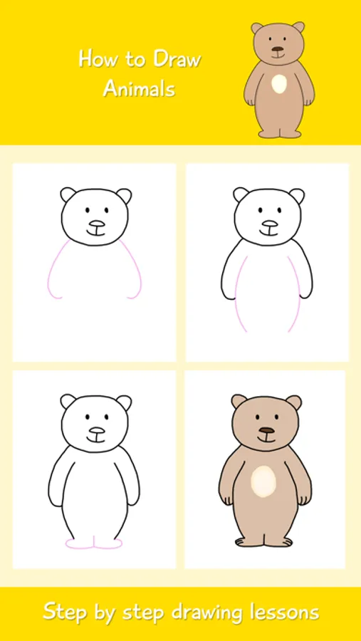 Kids can draw a picture in 6 to 8 steps starting from a basic circle and ending with a real drawing.
