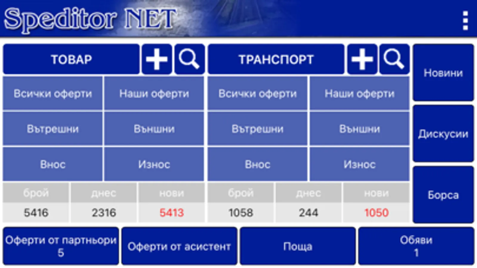 Транспортна борса, новини, дискусии, вътрешна поща, обяви, оферти от партньори и асистент.