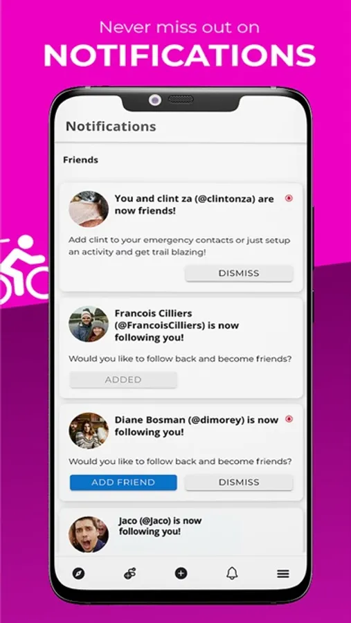 - Manage all your notifications from panic alerts, friend check-ins, new followers, and upcoming events in our user friendly Notifications hub.