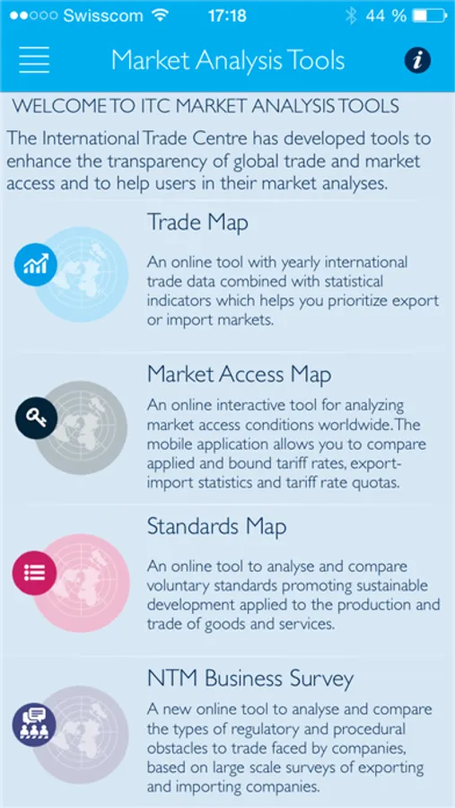 The International Trade Centre (ITC) created online Market Analysis Tools - Trade Map, Market Access Map, Standards Map and NTM Business Survey – which aims to improve international trade transparency. ITC free online databases empower SMEs, Trade & Investment Support Institutions and policymakers to identify export/import opportunities and make important decisions.
