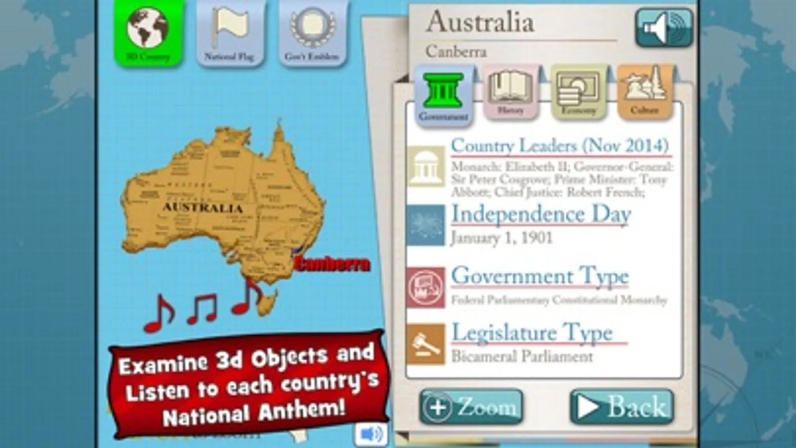 - Inspect and play with a 3D model of each country and discover its major cities, capital, rivers, and more