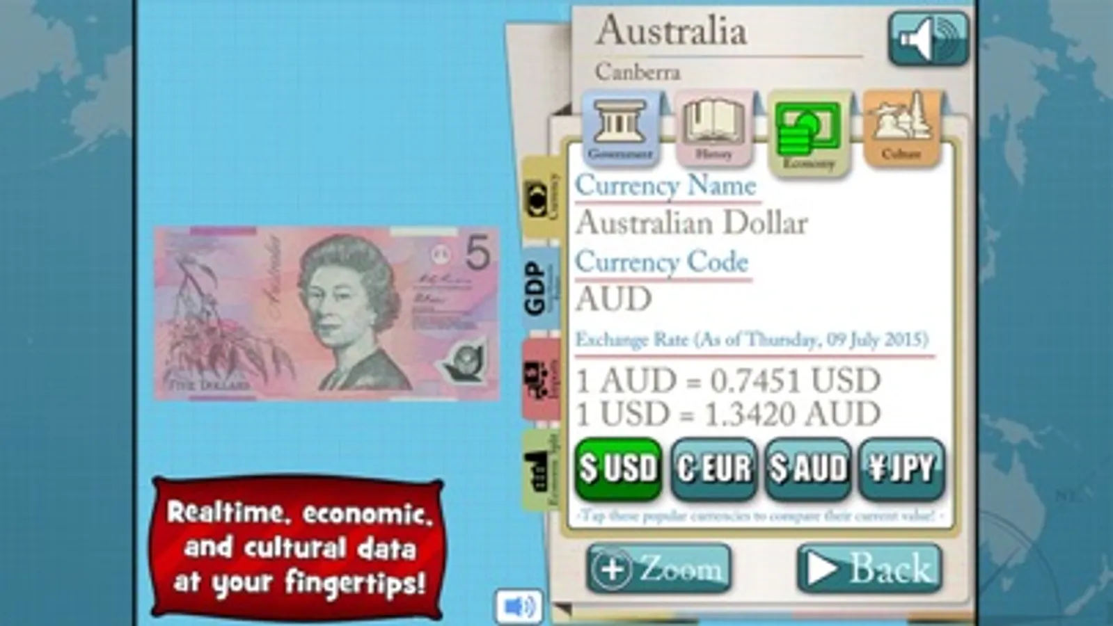 - This all in one app also provides each country’s economic data including its GDP, currency, exchange rate, import/exports, and more