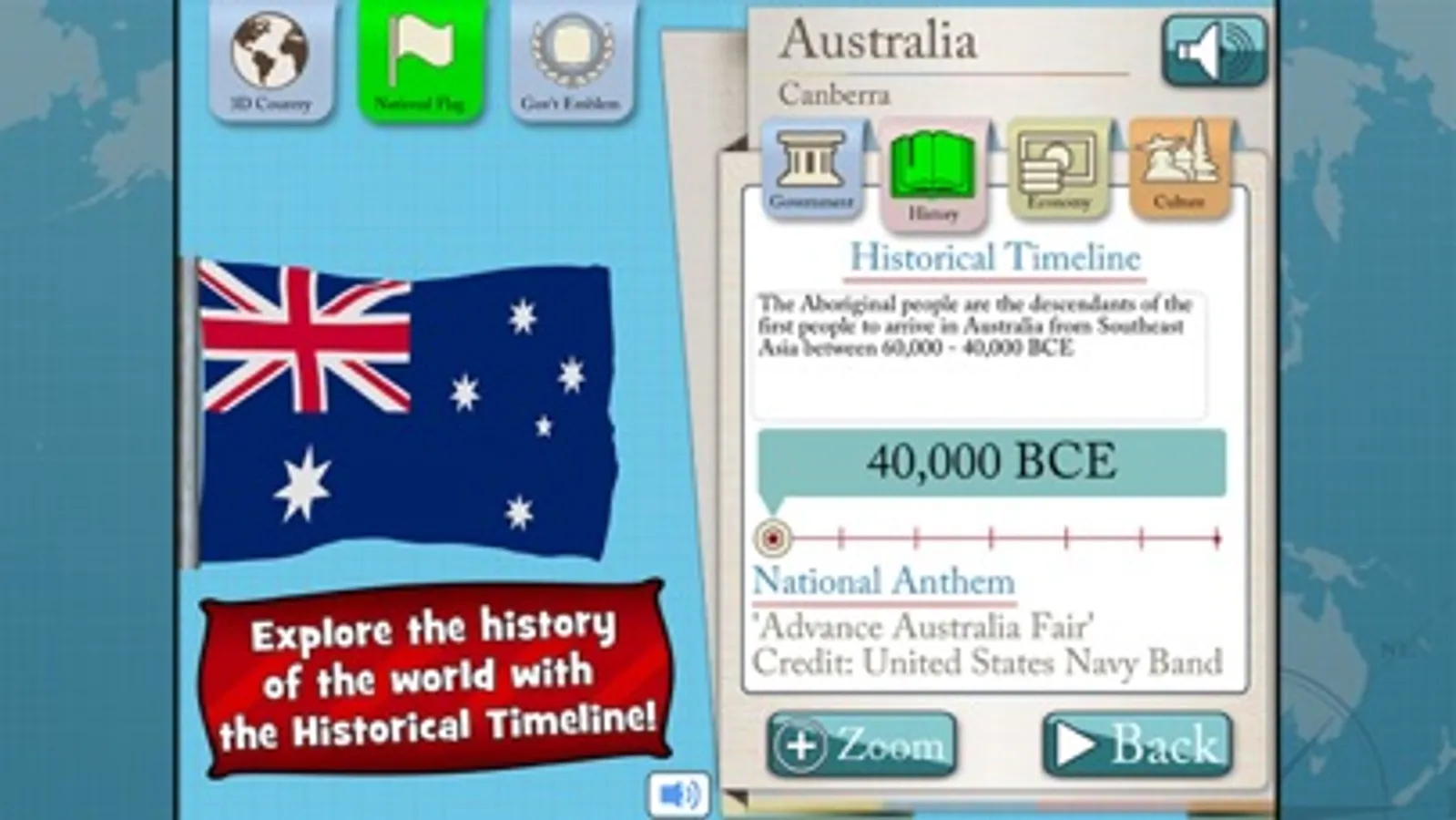 - Learn all about some major events in each country’s history by traveling along the historical timeline