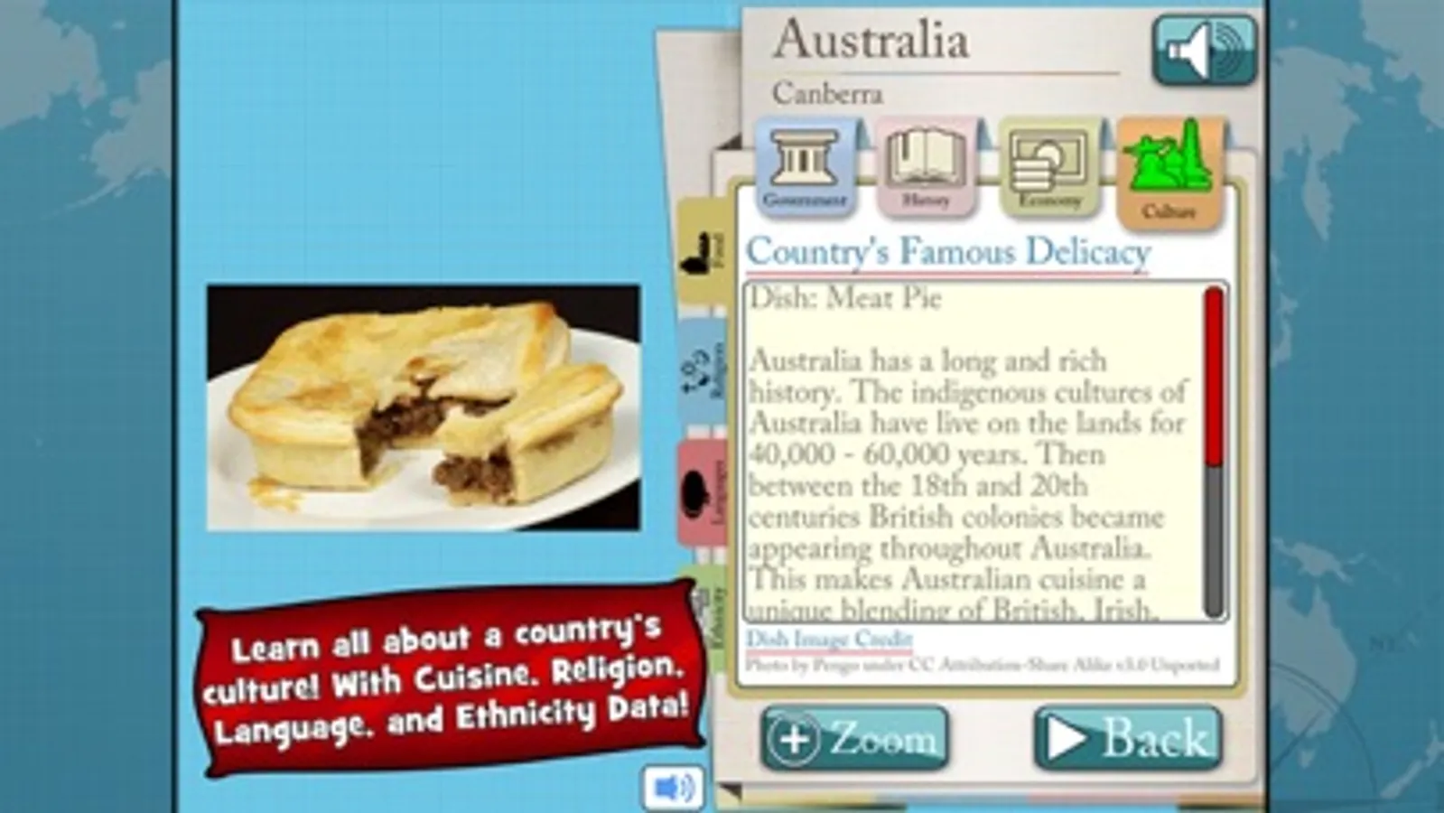 - Dive into every country’s cultural data including cuisine, population by ethnicity, languages spoken, and religion