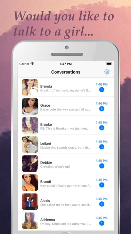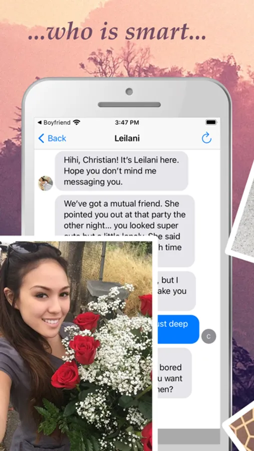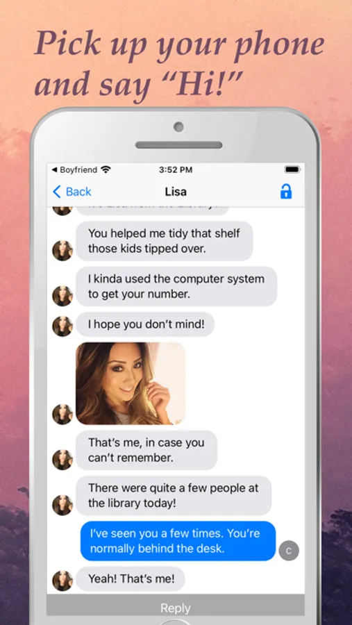 Start a conversation with a beautiful intelligent woman. Perhaps you met at a party, or maybe it was while taking a stroll through the park. As you get to know each other better, she'll send you pictures and voice messages. Choose wisely and you might just end up calling her your girlfriend. Who needs a girlfriend when you have Girlfriend Plus?