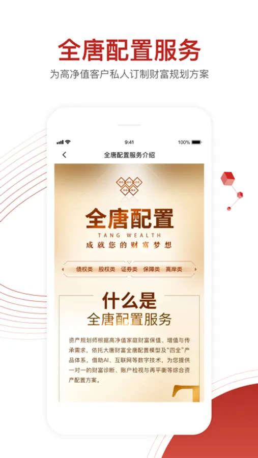 作为中国私人银行服务的领航者,大唐财富立足客户需求,依托“四全”产品体系,为广大高净值客户提供“全唐配置”综合资产规划服务方案,全方位满足客户在财富管理和乐享生活等方面的需求,成就客户的财富和人生梦想。