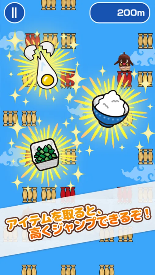 トゲ付のワラ納豆を踏んだり、画面の下に落ちてしまうとゲームオーバー!
