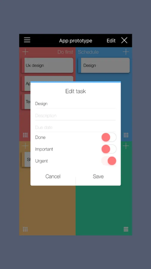 The app aims to reduce endless lists, reminders, other clutter and to be overly complex - all content revolves around a simple 2x2 matrix. It reduces complexity to allow you to focus on priorities and maintain inner peace and balance.