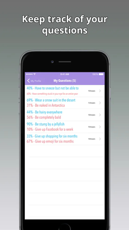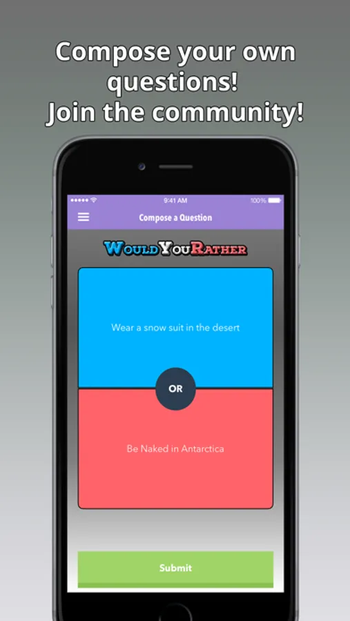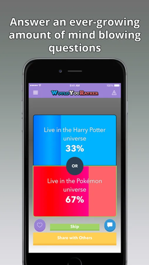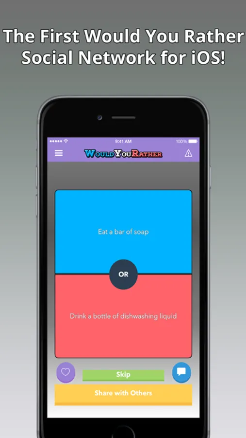 Welcome to the first Would You Rather (WYR) Social Network on iOS! Answer insanely hilarious questions with two possible answers that will blow your mind. Submit your own questions and see what the community answers. Answer and compose the most question to become First Place in the Leaderboards! The WYR app has a huge amount of questions, and more questions are added every day. Have a good laugh with this application and join the WYR community!