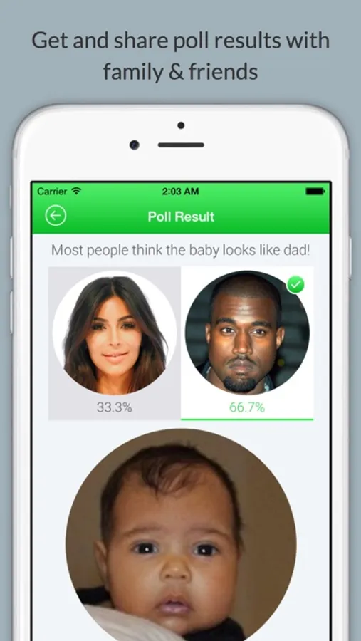 Ever wonder which parent a baby or child looks like the most? Is it Mom or Dad? Maybe the child has Dad’s nose but Mom’s big smile, or the resemblance flips back and forth by the day. With BabyLooks, you can capture these fun debates in a lighthearted way and bring friends and family into the conversation—no matter where they are.