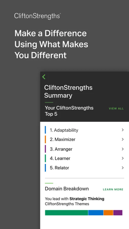 For CliftonStrengths consumers, this app lets you discover and understand how to use strengths daily to achieve success. Decades of Gallup research has shown that the talents most directly related to the potential for success can be grouped into 34 themes, and each theme comprises many talents. Of these 34, each person has five unique “signature strengths” that dominate their actions and behaviors. Join millions of others who have discovered their signature strengths and begin realizing the benefits of leading a strengths-based life.