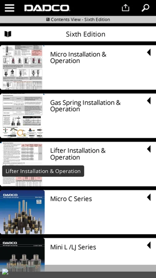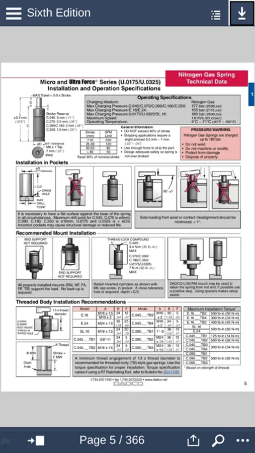 Browse the comprehensive collection of nitrogen gas springs, nitrogen gas spring lifters, guide retainer sets, air cylinders and other high-quality DADCO products. With this interactive catalog you can quickly navigate to specific catalog content by using hyperlinked tabs, thumbnails, content listing or page number. Other cool features include sticky notes and bookmarks that can be applied to frequently referenced pages. Using touch navigation, you can easily flip through the pages of the book to access the products. Each product include the necessary dimensions, force information, accessory options and part number to aid in the selection of the best items to include in your die design. Download the App now to get the popular DADCO Mini Book at your fingertips.