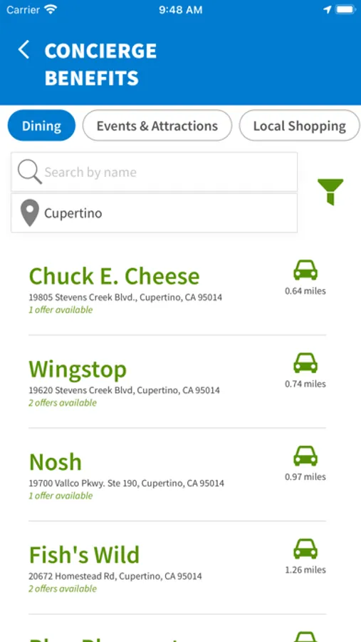 • Easily find great savings and discounts from businesses near your current location, including map and directions