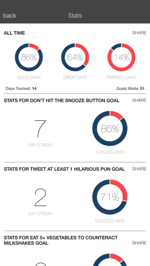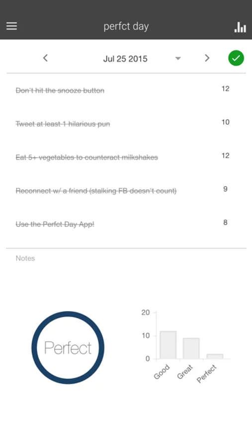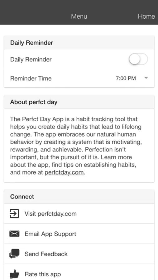 The Perfct Day App is built to help you achieve your long term goals through daily habits. The app embraces our natural human behavior by creating a system that is motivating, rewarding, and achievable. Perfection isn't important, but the pursuit of it is. Start changing your life, and make today a Perfect Day.