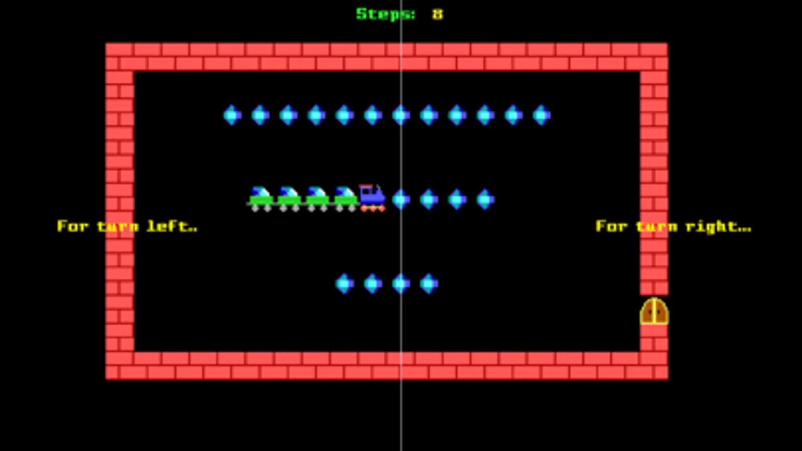 Train Snake is a classic retro type of game Snake. Where you are trying to collect all the objects on the screen while trying to avoid your own wagons, walls and successfully reach the finish which is an open gate. The gate opens when all the objects are collected.