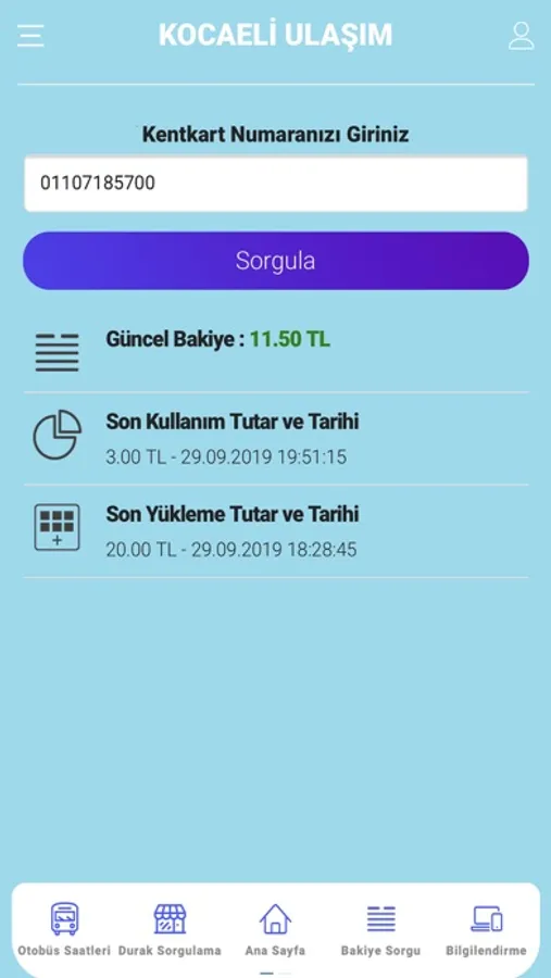 Kentkartınızda kaç lira bakiye olduğunu öğrenebilir, sms özelliğini aktif ederek kalan kentkart bakiyenizin cep telefonunuza sms gelmesini sağlayabilirsiniz.