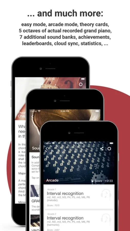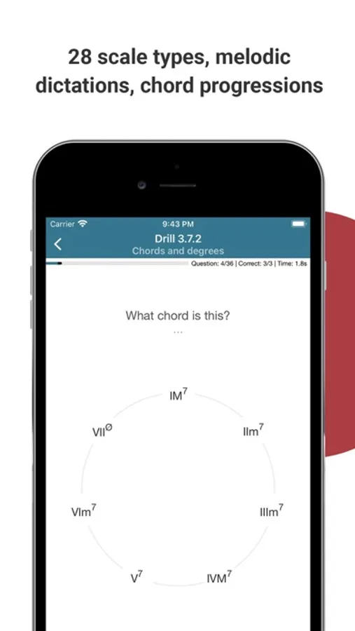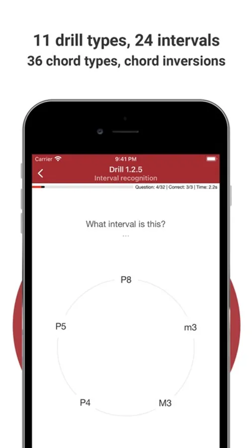 • 11 drill types, 24 intervals, 36 chord types, chord inversions, 28 scale types, melodic dictations, chord progressions