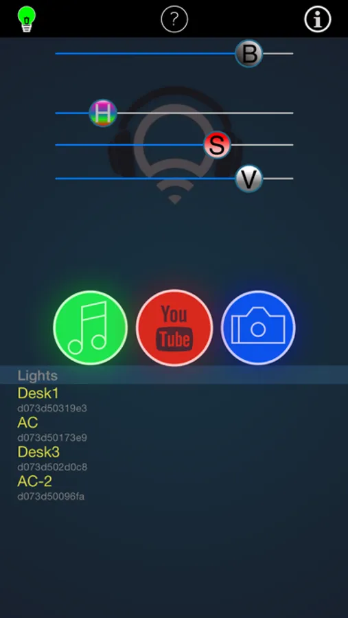 - Motion. Move the phone along its 3 axes (Yaw, Pitch and Roll) and watch your lights change Hue, Saturation and Brightness respectively. Flip phone to turn lights on or off. Spin it to see it go through the colour wheel!