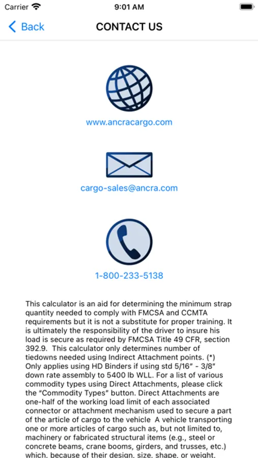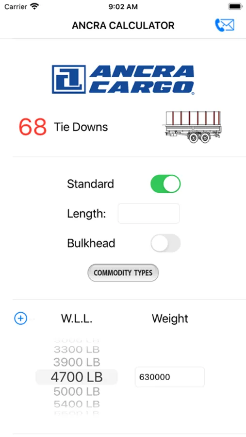 Tie down calculator application provided to you by Ancra International is an aid for determining the minimum strap requirements needed to comply with FMCSA and CCMTA. To calculate the correct number of Ancra tie downs to use, simply select the length of the load, choose bulkhead vs. no bulkhead, choose the appropriate working load limit of the strap, and enter the weight of the cargo. These variables will supply you with the correct number of tie downs to use for a hauling a secure load.