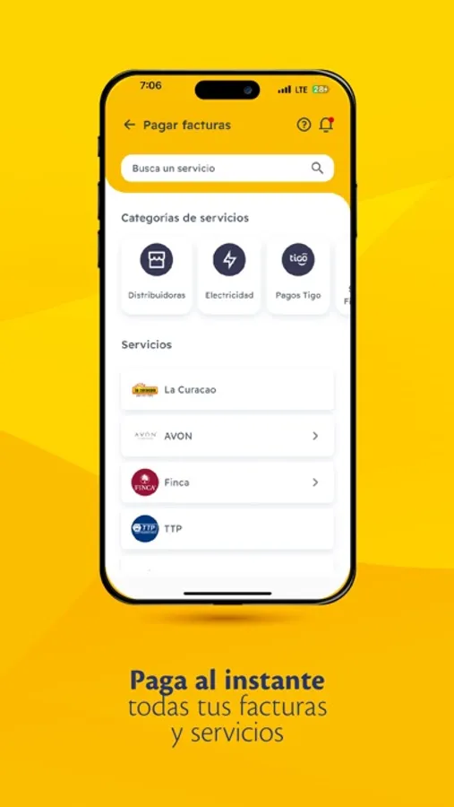 • Pago de facturas de agua, luz, gas y Tigo Hogar. AVON, Azzorti, Banco Azteca, Banco de Antigua, Banco Inmobiliario, BELCORP, Capillas Amanecer, Chepe te presta, Cosami, Credi Operaciones, EEGSA, El gallo más gallo, Energuate, Finca, Flushing, Impulsa-t, Interconsumo, Lacuracaocash, Radioshack , Scentia, Tío Plata, Tropigas, YANVAL.