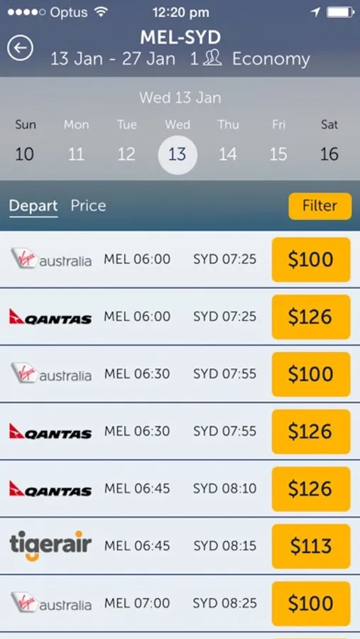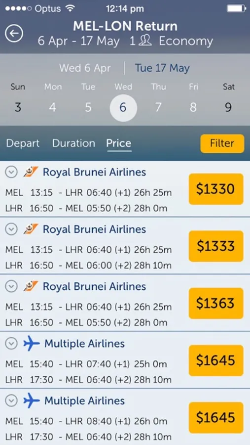 • Filter your flights by airline, stopover airports, price, duration and more.