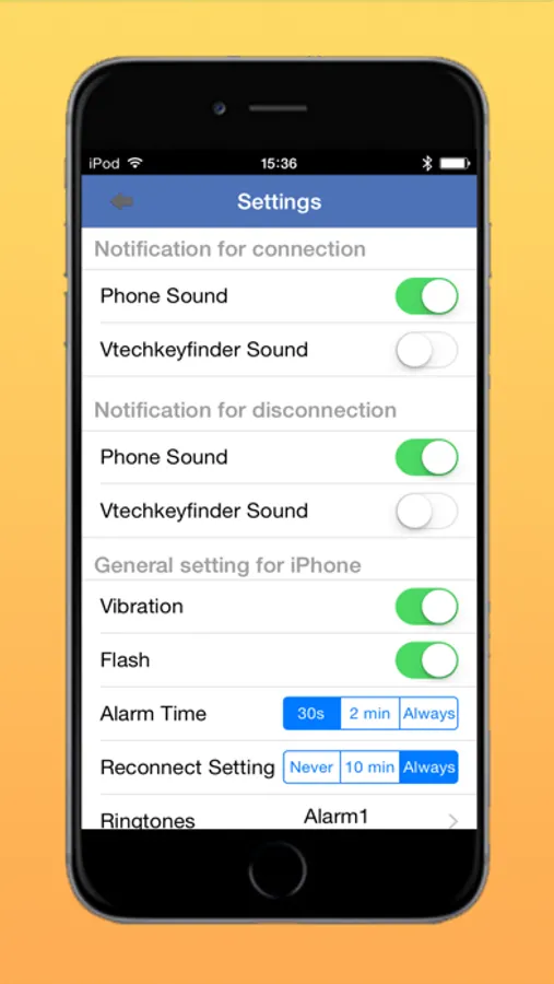 You can set to turn on/off the Phone Sound, Vtech Key Finder Sound when connection is paired or broken. Also you can set Vibration, Flash when alarming. Moreover, you can set the Alarm Distance which is NEAR or FAR and select the Ringtones of the phone when alarming.