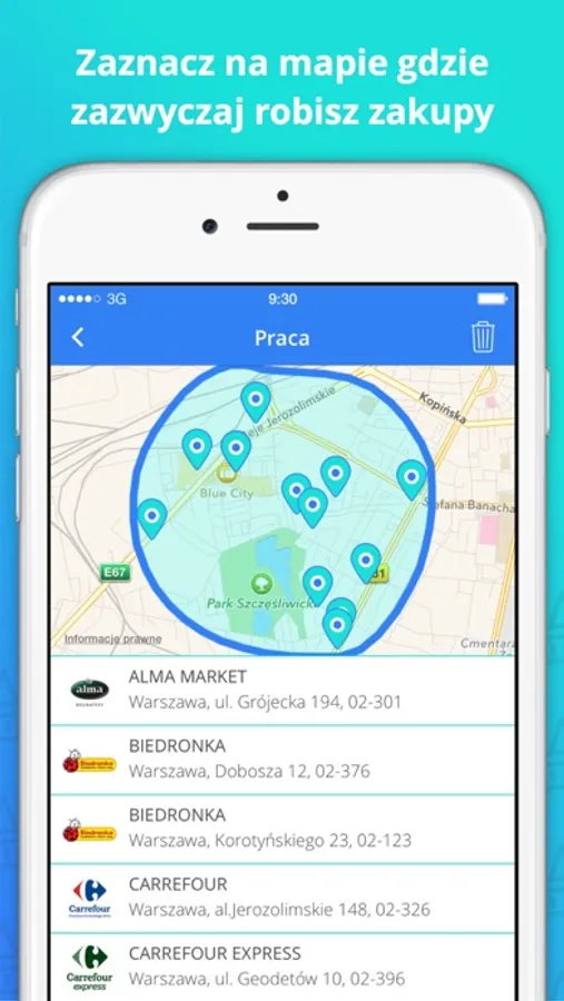 - prosty sposób na zaznaczanie preferowanego obszaru zakupów; wystarczy, że zaznaczysz palcem na ekranie telefonu interesujący Cię obszar, a aplikacja sama zlokalizuje sklepy na mapie